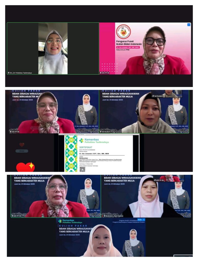 Pada hari Jum’at, tanggal 31 Oktober 2025 telah dilaksanakan kuliah pakar bagi seluruh civitas akademika Program Studi yang ada Jurusan Kebidanan dengan mendatangkan narasumber Ketua Umum Pengurus Pusat Ikatan Bidan Indonesia, Dr. Hj. Ade Jubaedah, S.SiT, Bdn, MM, MKM yang mengusung tema “Bidan sebagai Wirausahawan yang Berkarakter Mulia”. Tema ini tentu saja sejalan dengan Visi dan Misi Program Studi yang ada di Jurusan Kebidanan Poltekkes Kemenkes Tasikmalaya. Kegiatan kuliah pakar ini dibuka oleh Direktur Poltekkes Kemenkes Tasikmalaya dan dihadiri oleh mahasiswa, dosen dan tenaga kependidikan di jurusan Kebidanan. Kuliah pakar ini sebagai salah satu bentuk kegiatan untuk meningkatkan suasana akademik yang meningkatkan wawasan seluruh civitas akademika.